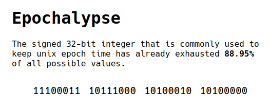 Le hic, c'est que ce compteur a été stocké sur un entier signé de 32 bits. En arithmétique binaire, ça représente 2 147 483 647 secondes maximum. Soit environ 68 ans à partir de 1970.